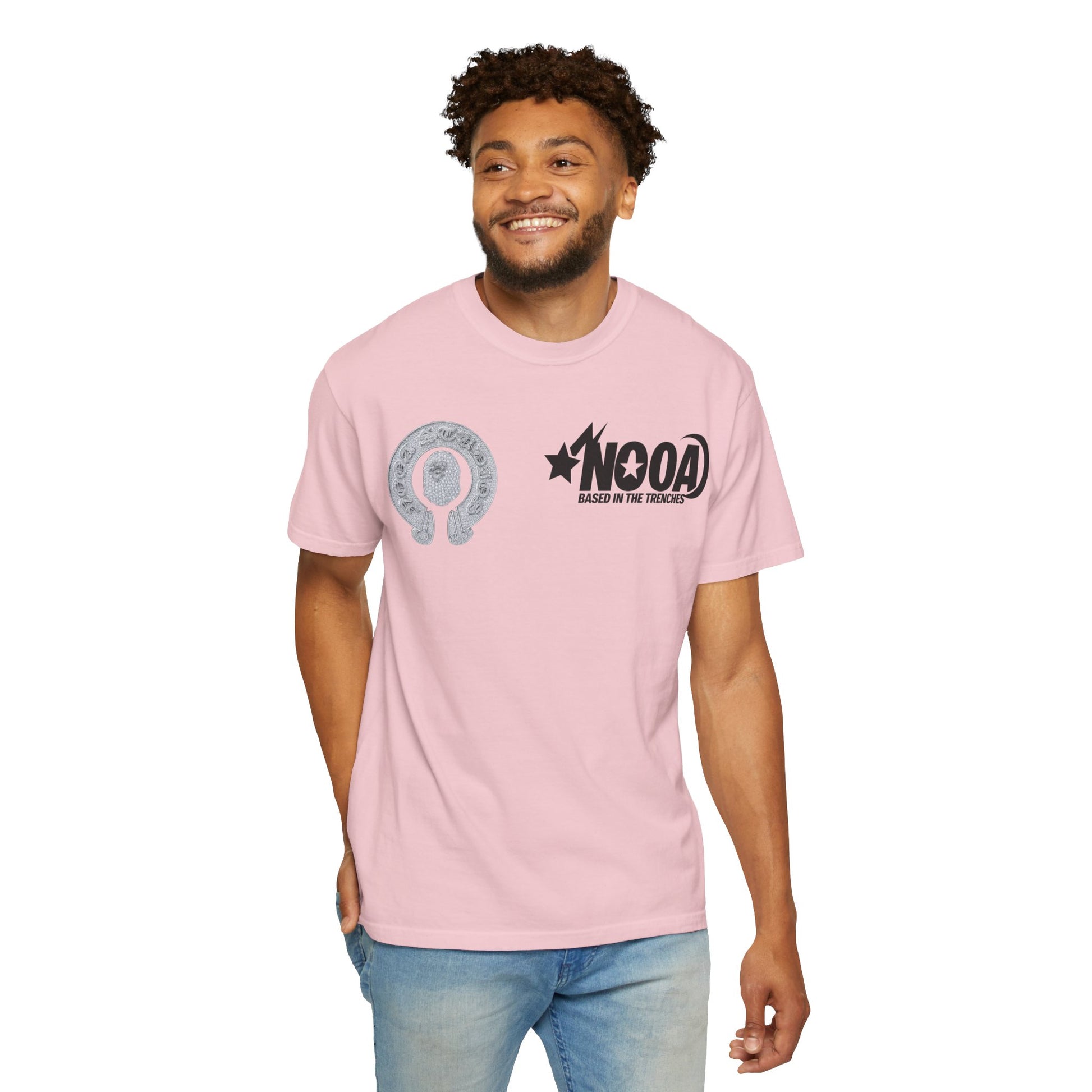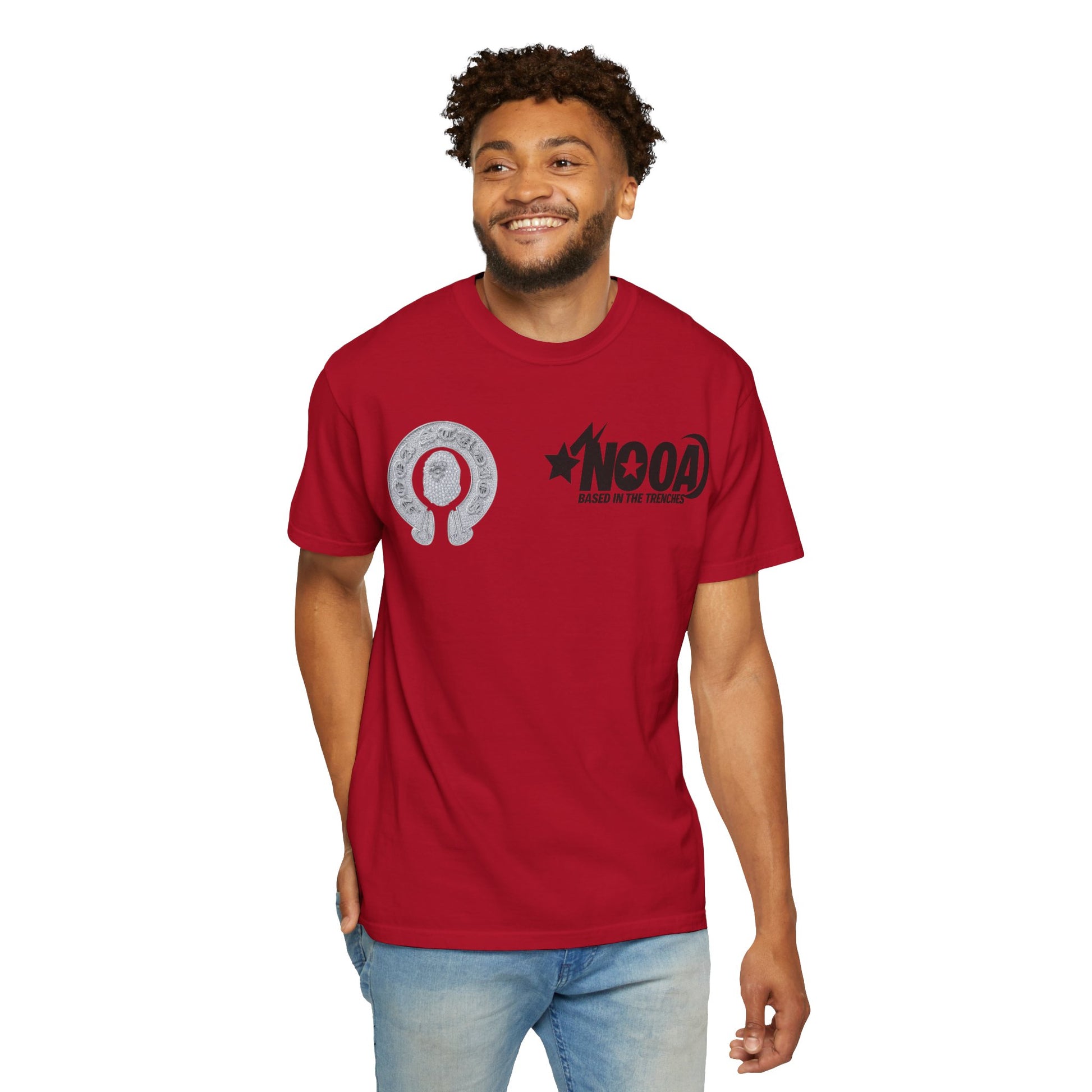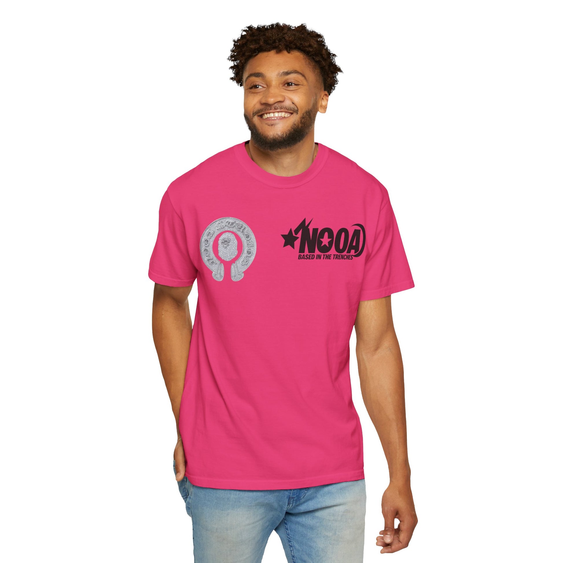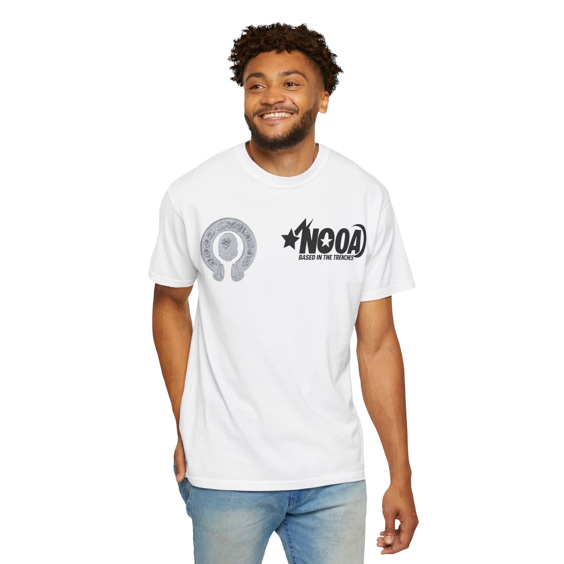 A relaxed, garment-dyed tee that wears in like a favorite — soft, substantial, and quietly bold. The heavyweight 100% ring-spun cotton has a lived-in texture from the post-construction dyeing, giving prints a slightly vintage, broken-in look. Clean front artwork sits on the chest while a larger, gritty emblem and logo rest across the back, lending a streetwise, underground vibe. This shirt slips easily into everyday rotation: layered under a jacket, thrown on for late-night gigs, or worn while working on rusted projects and creative experiments. It feels reliable on long days and looks like it belongs to a person who values authenticity and grit.